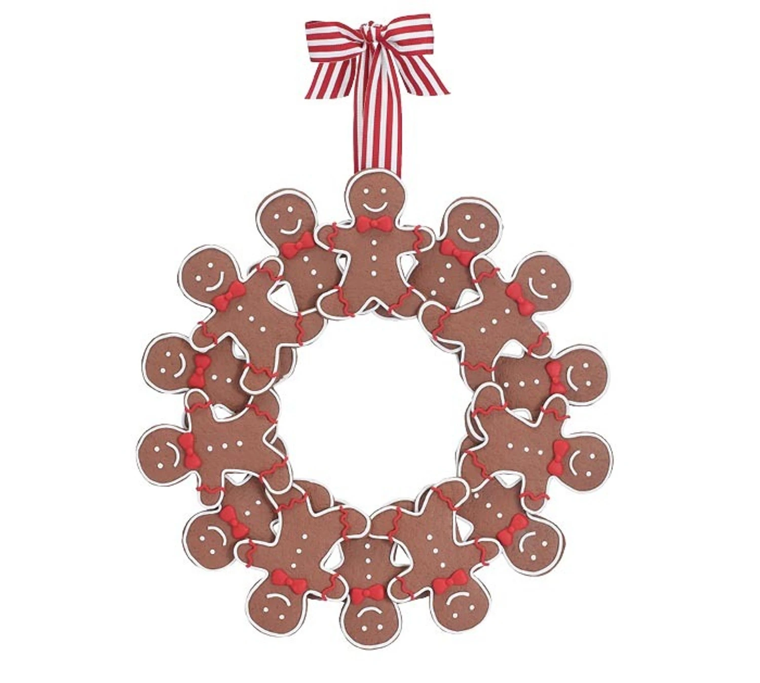 Sweeten up your Christmas decor with this cute wreath! It features gingerbread men layered on top of one another to create a circle. Each cookie has a small red bow and white icing accents! The wreath is suspended from a red and white ribbon and bow! Made of claydough. Dimensions: 18″ H x 18″ W x 1/2″ D. 23″ hanging from the ribbon. Item #: 9742089