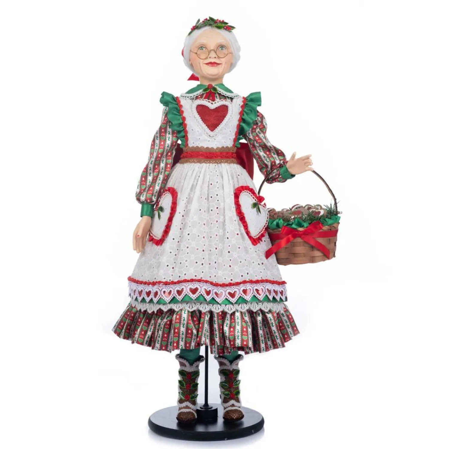 Mama Maple is dressed to impress and ready to get to bakin’! Her dress is a pretty floral brown striped dress with tons of ruffles, she wears a white eyelet apron with green frilly sleeves and a heart shape on the front! The apron is belted with brown lace and red ribbon and two heart shaped pockets are stitched on the lower portion of the apron and the bottom of it is lined with colorful ribbons! In her hand she holds a small basket full of cookies! Made by Katherine’s Collection. Made of resin, paper mache, and fabric. Dimensions: 16.5 × 16.5 × 32.5 in. Item #: 28-328726