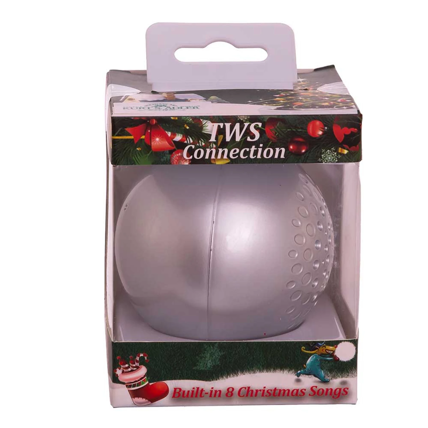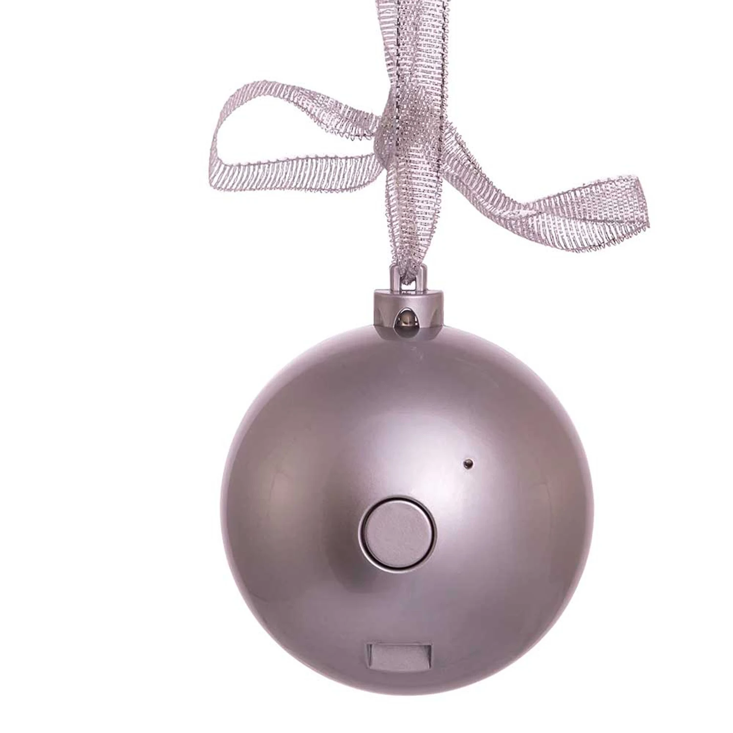 Discreetly play your favorite Christmas music this holiday season with this awesome decoration! It features a silver ball ornament that connect to your phone and hangs on your tree to play songs so your guests can sing along! Speaker connects via bluetooth, directions included in package. Made by Kurt Adler. Made of plastic. Dimensions: 75MM ball ornament. Item #: USB1300