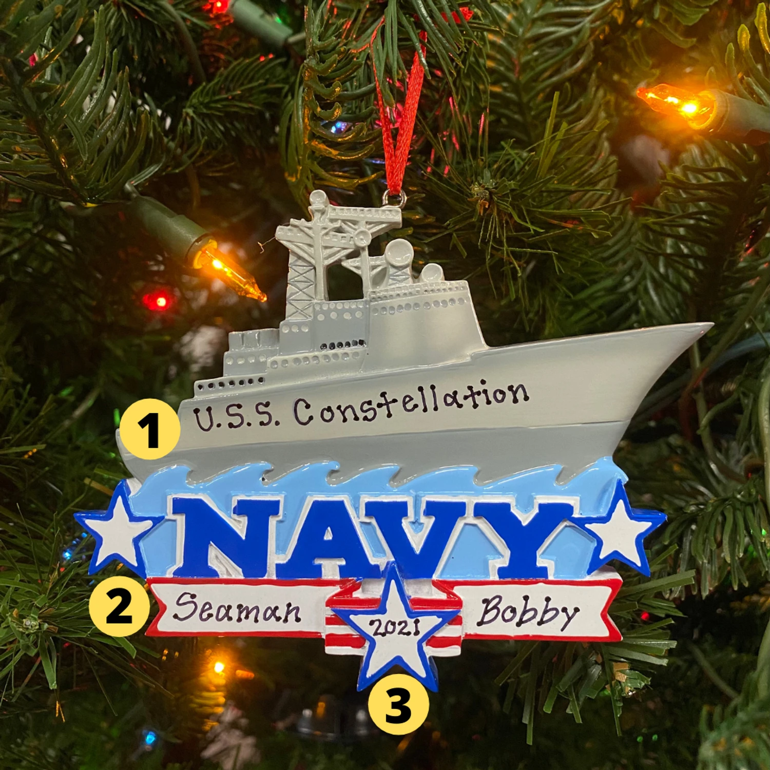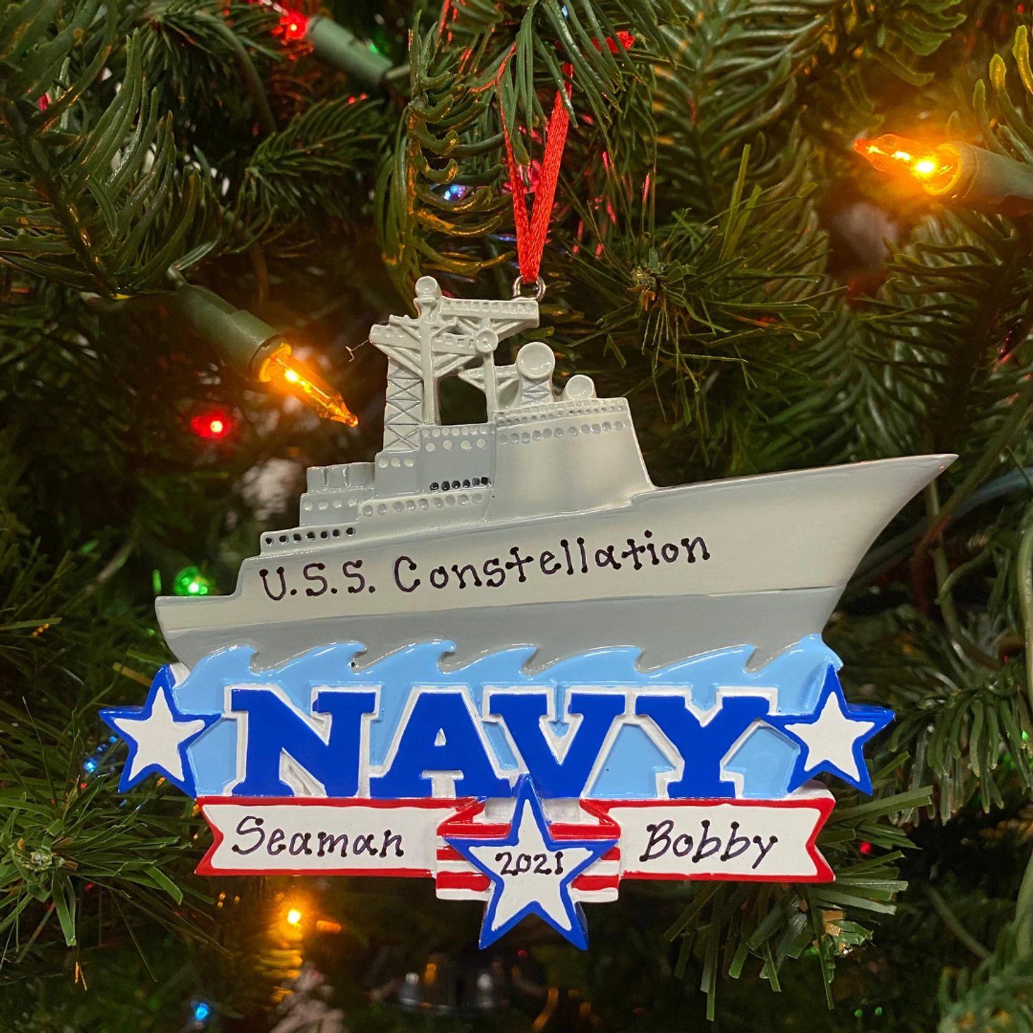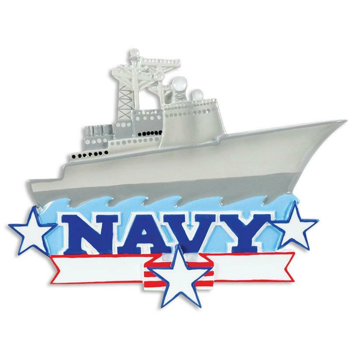 Celebrate your loved ones that dedicate their lives to our country with this awesome ornament! It features a sleek silver Navy ship on the water with a banner at the bottom to put your name and the year! Made of resin. Dimensions: 5″ x 3.75″. Item #: OR1394