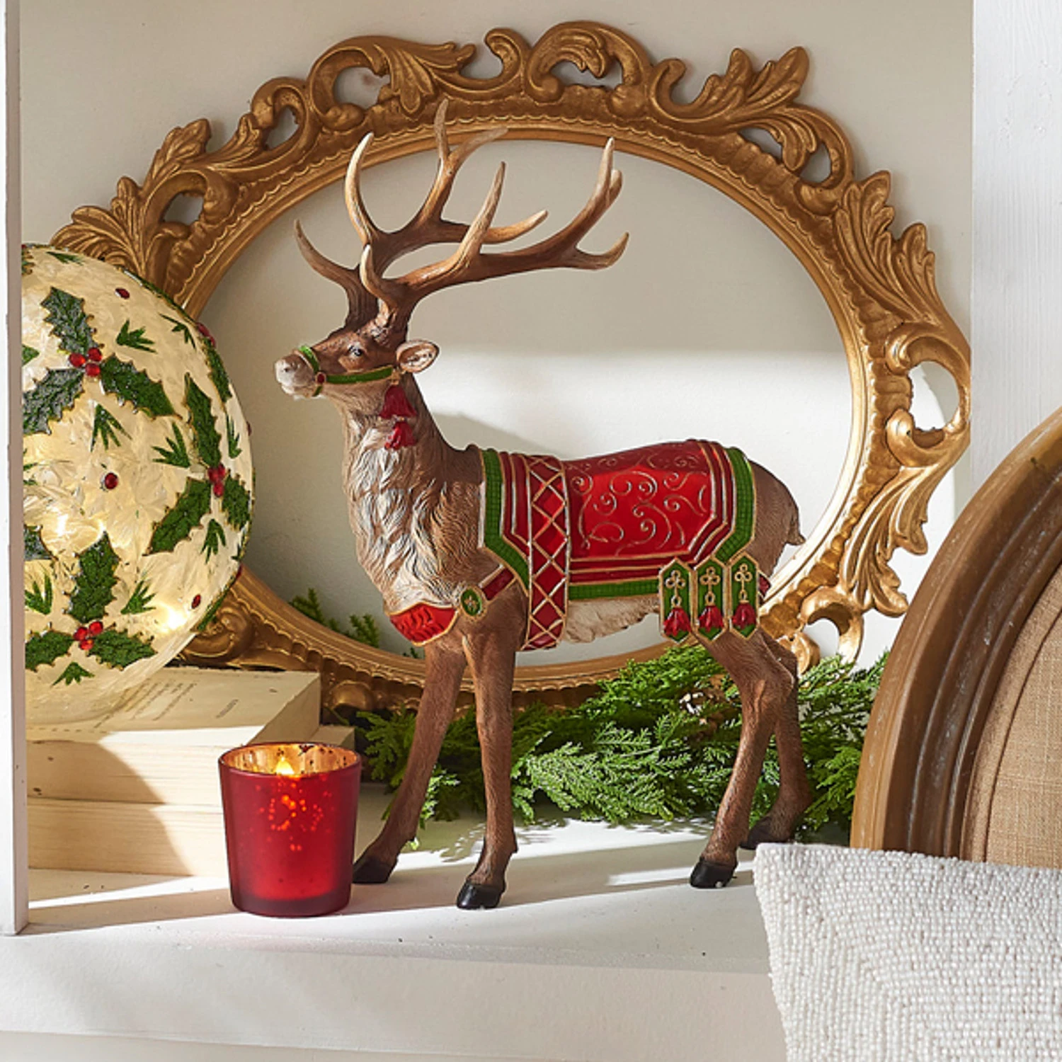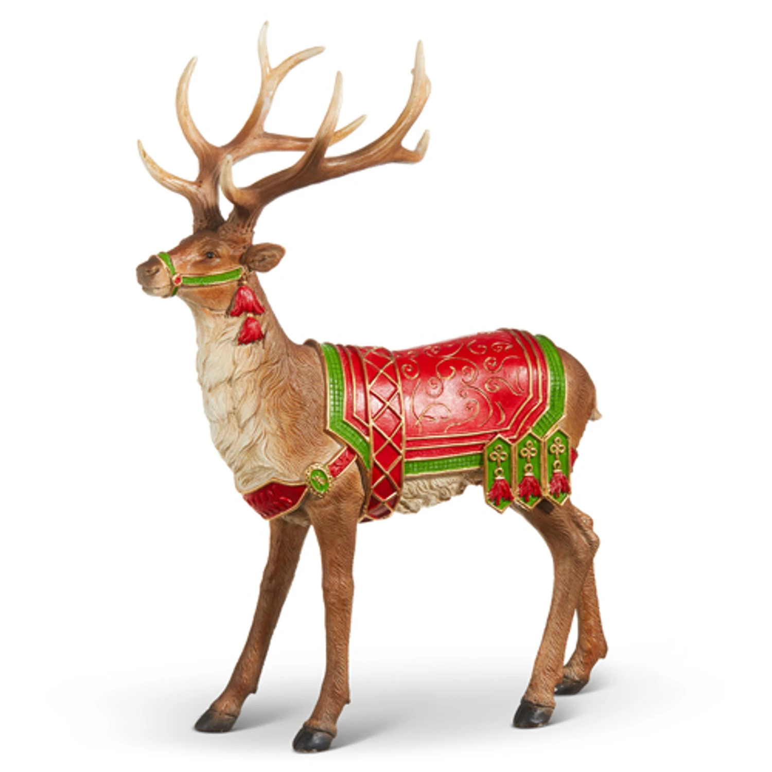 Decorate in style this year by adding this stunning reindeer! This figure features a brown deer with white fur in the front and a set of tall antlers! He wears a red saddle with green and gold accents that match the reins on his face! Made by Raz Imports. Made of resin. Dimensions: 9″ L X 5″ W X 12.5″ H. Item #: 4301612