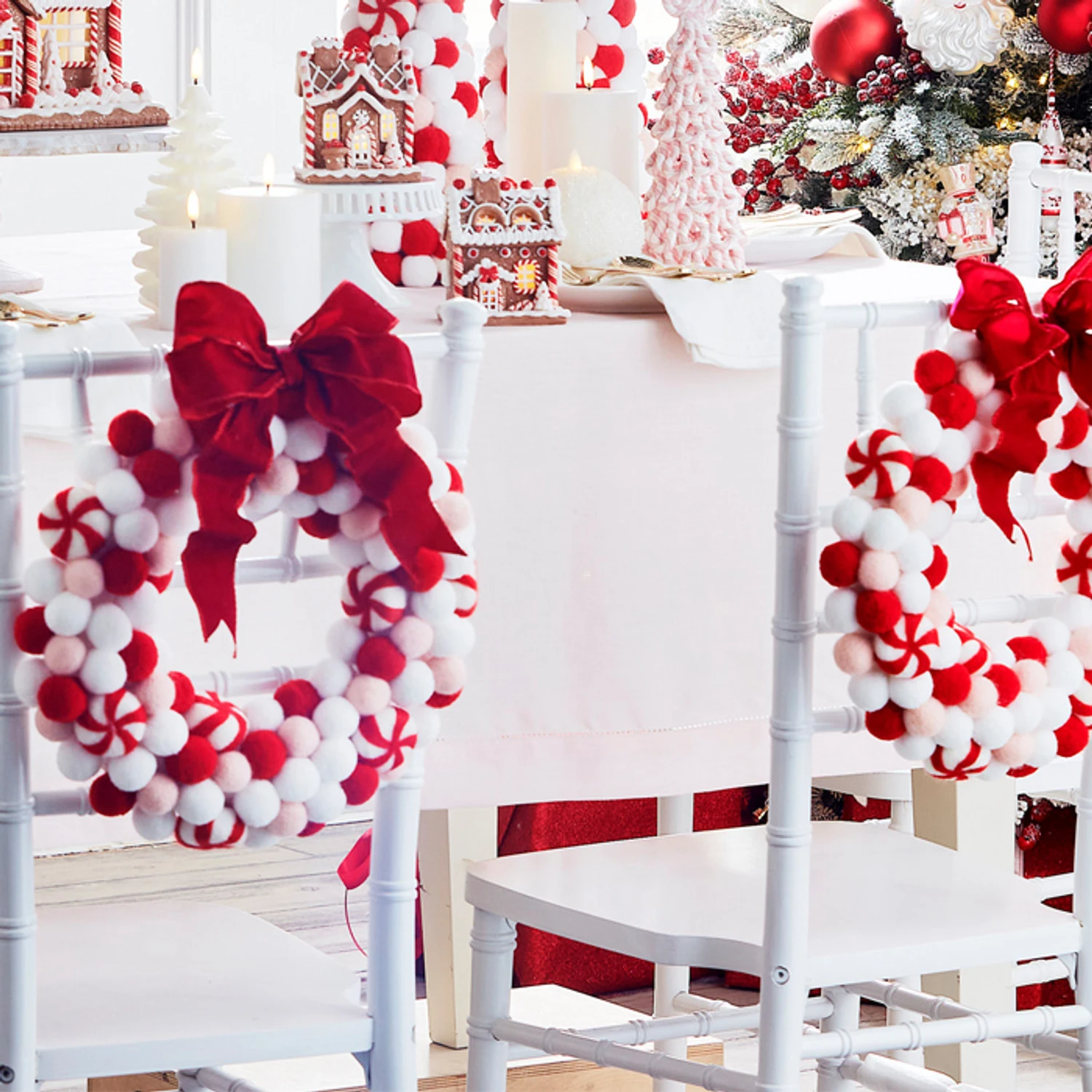 Have you ever seen a cuter wreath?? It features light pink, bold red, and bright white pom pom balls dotted with red and white peppermint candies in the shape of a wreath finished off with a red velvet bow! Made by Raz Imports. Made of polyester, wool, and felt. Dimensions: 13″. Item #: W4316146