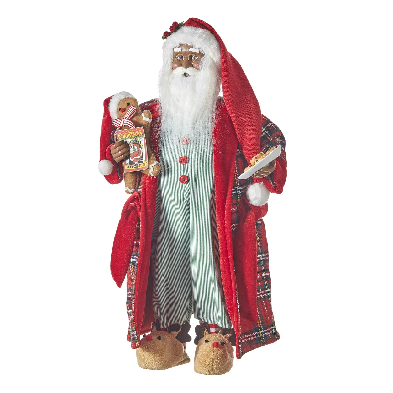Santa is ready for a fun night in! He’s dressed in green and white pin stripe pj’s with red buttons and a red plaid robe over top! In one hand he holds a stuffed gingerbread toy with a bedtime story and in the other a plate of freshly baked cookies! Check out all of our African American Christmas decorations here Made by Raz Imports. Made of polyester and plastic. Dimensions: 10.75″ L x 7.75″ W x 18″ H. Item #: 4115558