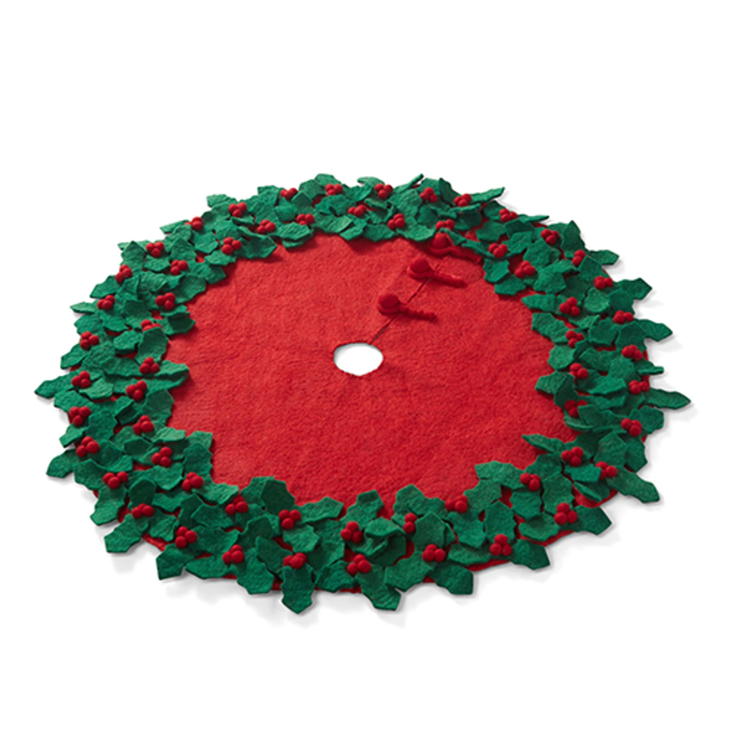 Throw out that old Christmas tree skirt and snag a new one this year! This one features a red skirt that is decorated heavily with felt holly leaves and clusters of red pom pom ball berries with elegant buttons to fasten the skirt in place! Made by Raz Imports. Made of polyester. Dimensions: 34″. Item #: 4371825