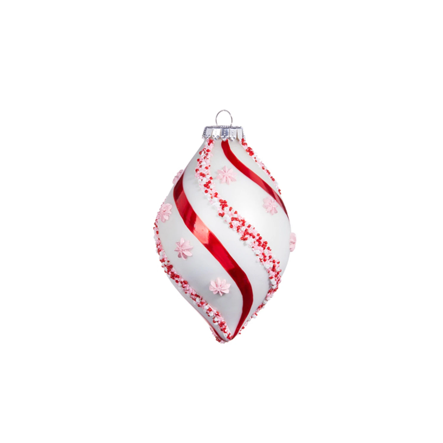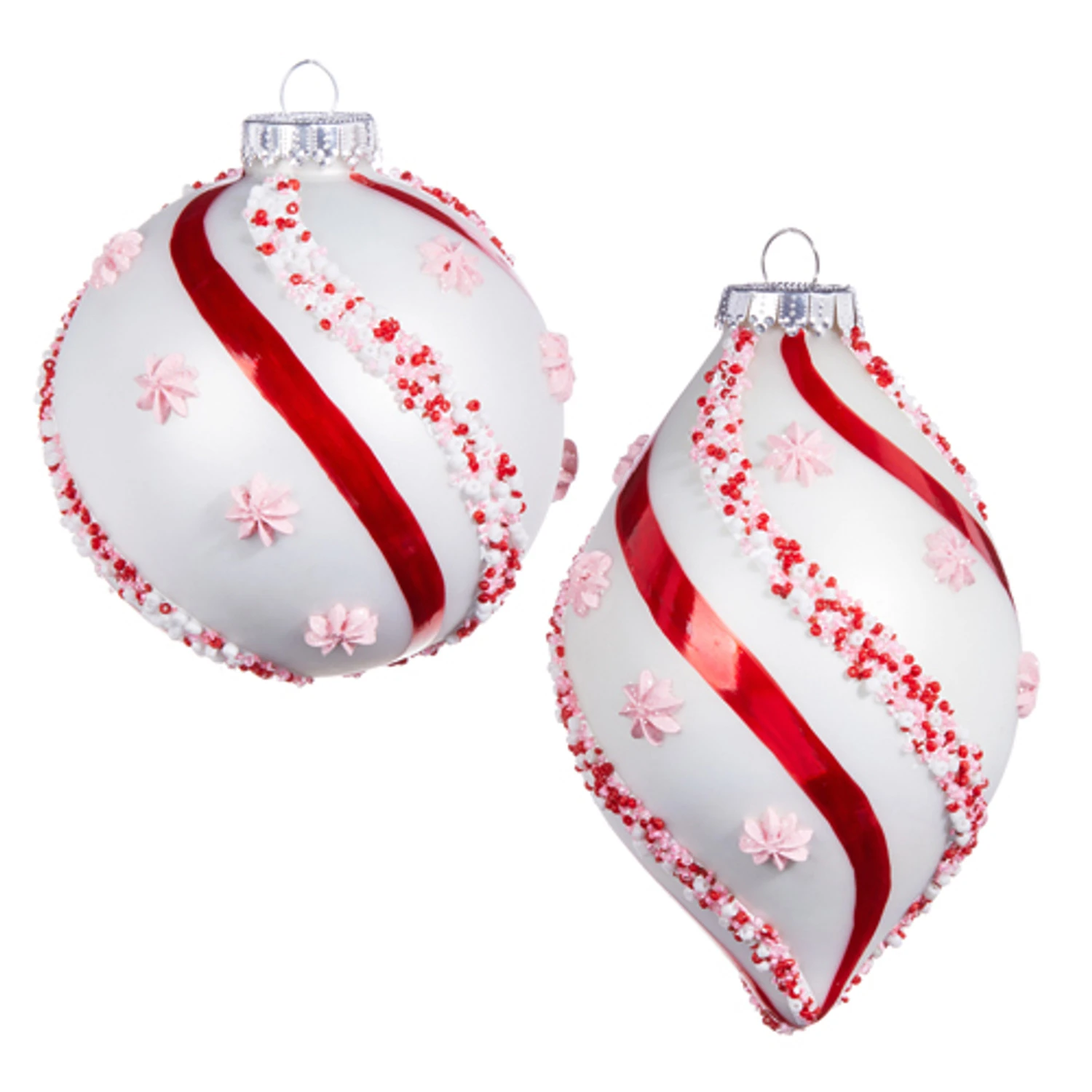 These white glass ornaments are swirled with a red stripe, a stripe of pink and red sprinkles, and dollops of light pink icing! Perfect to place throughout your tree, in a wreath, or garland! Each sold individually OR as a set of 2. Made by Raz Imports. Made of glass. Dimensions: 4.5″. Item #: 4352874