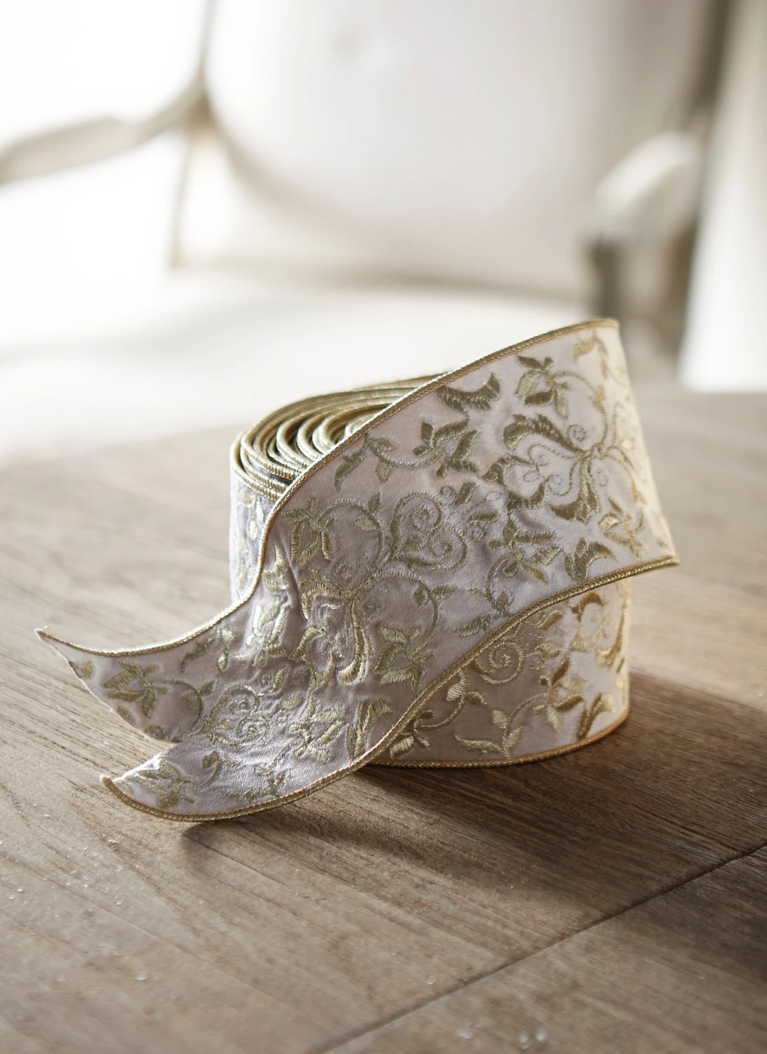 Raz 4″ Embroidered Champagne Wired Christmas Ribbon R4371784