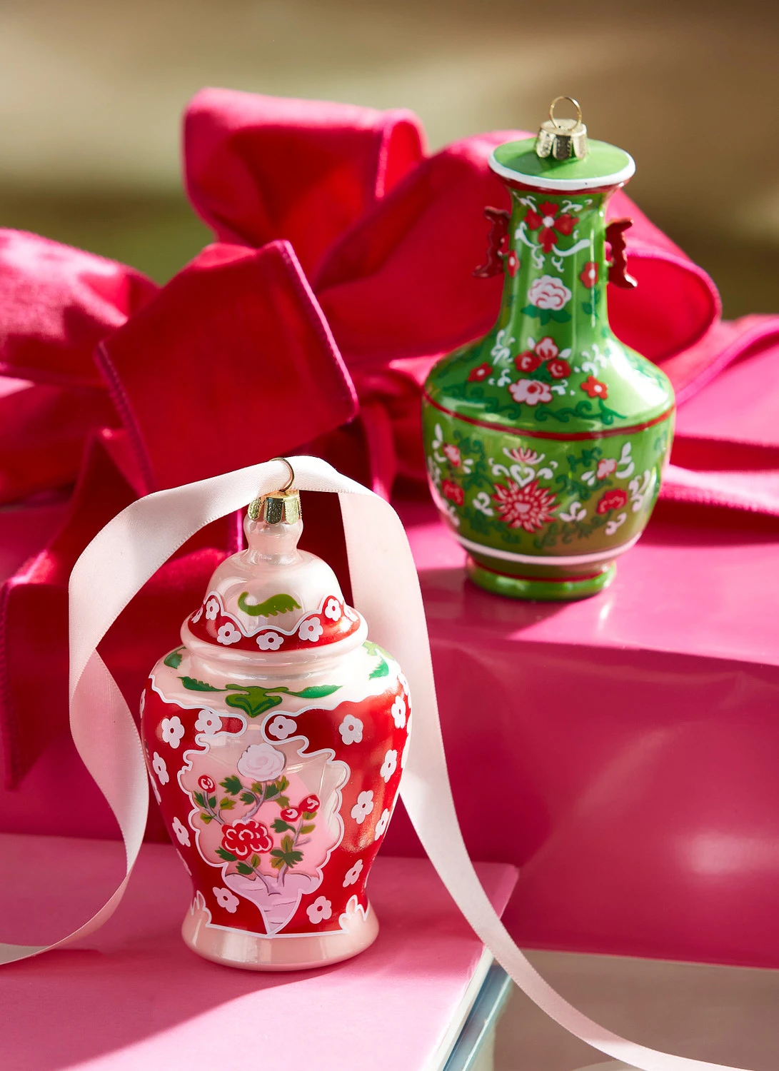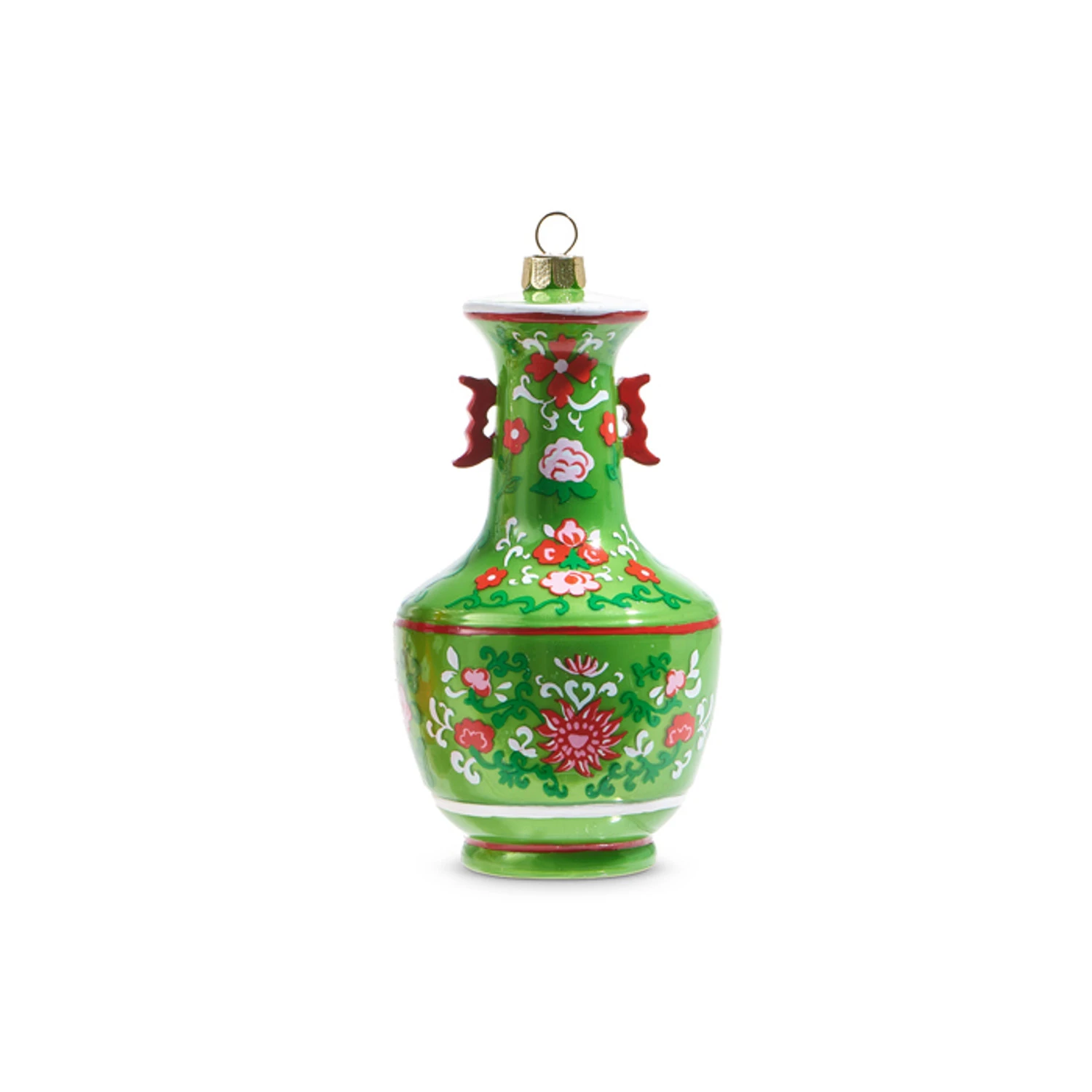 These stunning ornaments feature a unique glass vase shape decorated with a gorgeous floral design made up of tiny roses, greenery, swirls, and small flowers! Each sold individually OR as a set of 2. Made by Raz Imports. Made of glass and resin. Dimensions: 3″D X 5″H. Item #: 4352888