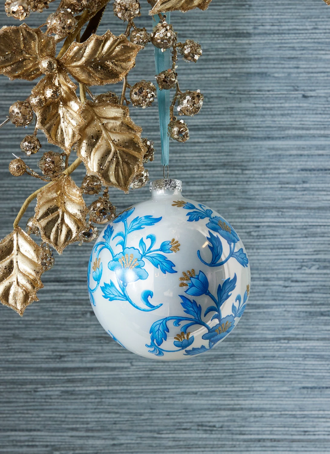 This gorgeous ornament features a white glass ball ornament with a delft blue floral decals all over the ornaments decorated with gold glitter! Made of glass. Made by Raz Imports. Dimensions: 5″. Item #: 4352895