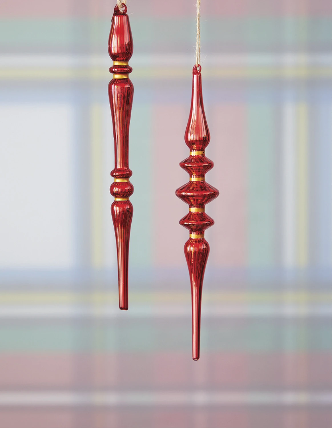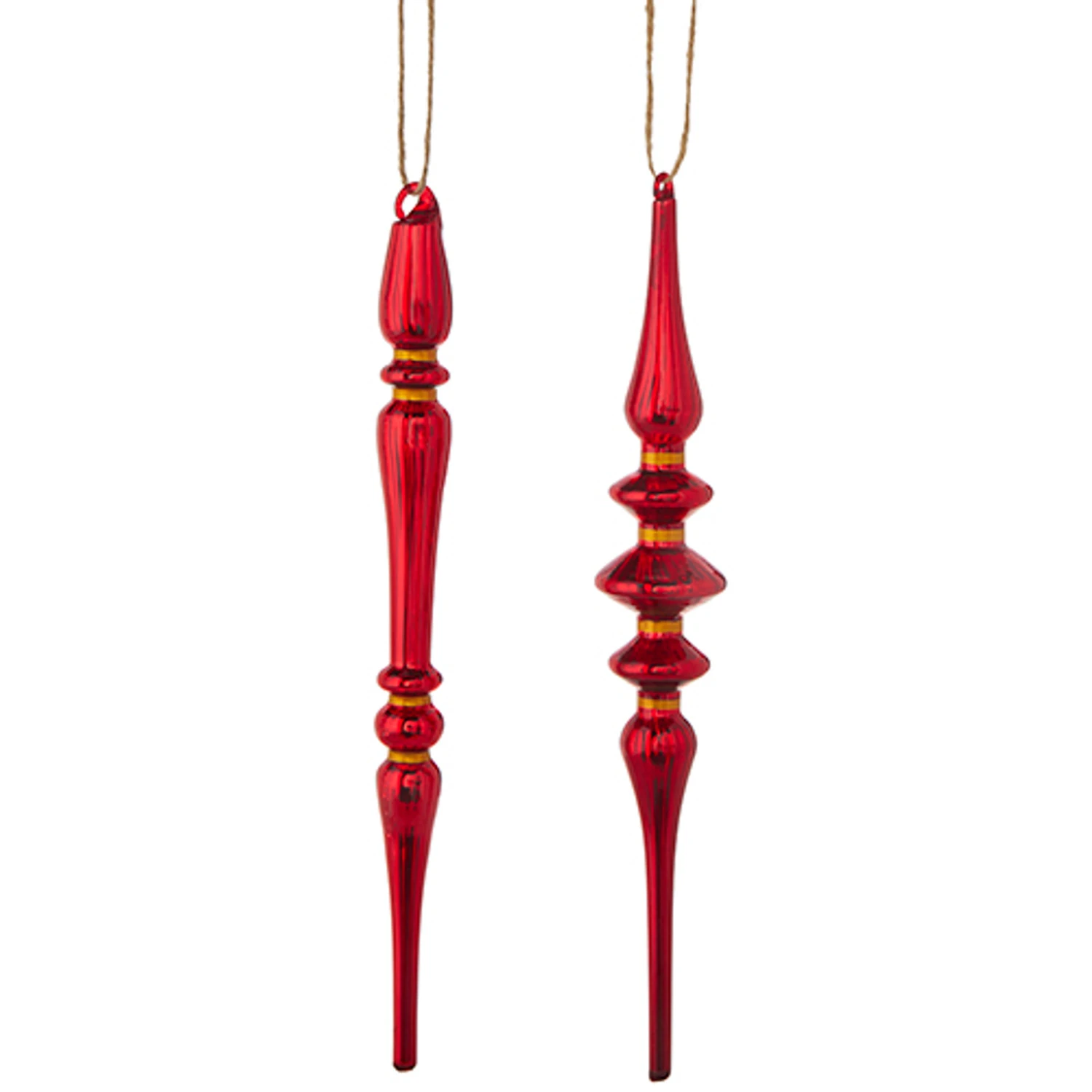 These gorgeous finials are like non other! Each is made with shiny red glass with small gold stripes! These are great to hang on the tips of the branches on your tree or along your favorite garland! Each sold individually. Made by Raz Imports. Made of glass. Dimensions: 9.25″ tall. Item #: 4220893